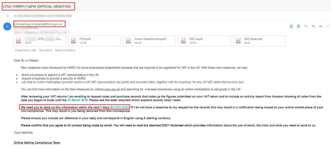 卖家要不定期查看所有在电商平台和 HMRC 注册过的电子邮件,一旦收到来自onlineselling.compliance@hmrc.gov.uk或是 Onlineselling.compliance@hmrc.gsi.gov.uk 查账信,一定要在截至日期前回复税局,并确保收到税局的自动回复!一定要保存好该自动回复邮件,这是证明自己及时回复税局的重要凭证。不及时回复税局邮件,将面临账号冻结的风险!
