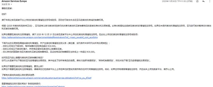 近段时间,不少卖家都有收到了亚马逊要求卖家上传奥地利VAT的邮件通知,邮件内容大致为:请卖家于2020年12月31日之前上传您的奥地利VAT税号,否则您可能会失去在亚马逊奥地利商场的销售权限。
